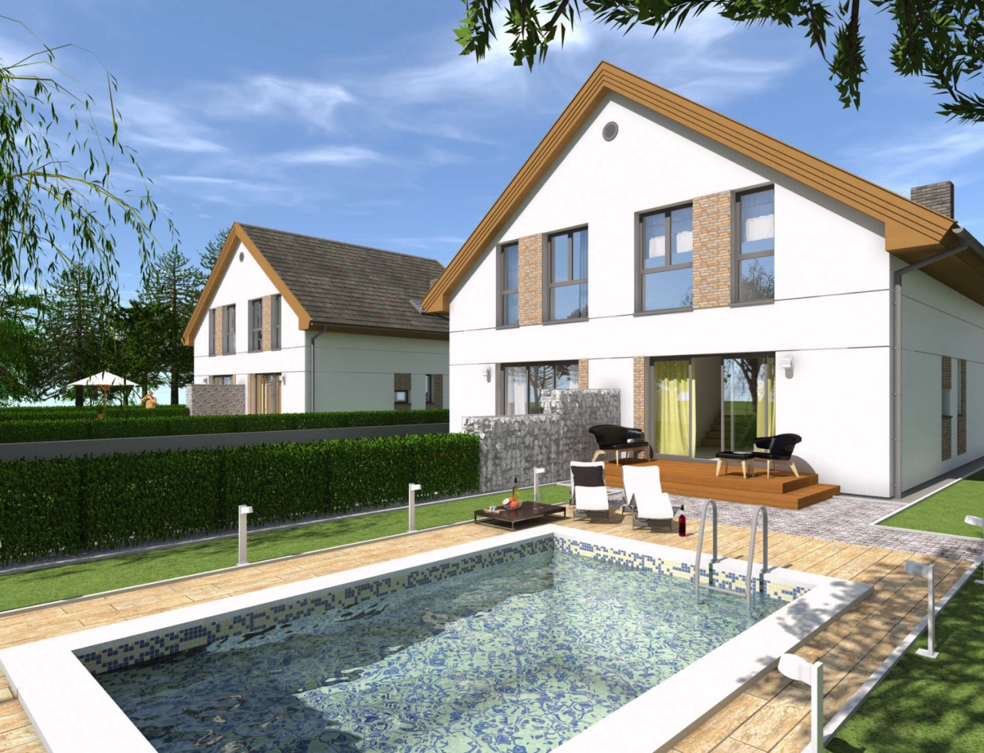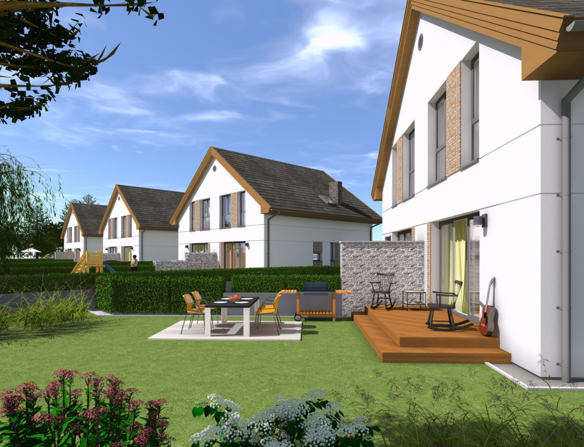 Zespół czterech budynków dwulokalowych o łącznej powierzchni 674m2, został zaprojektowany i wybudowany w Dołujach, gmina Dobra. Każdy lokal posiada niezależne wejście i duży ogród. Układ funkcjonalny przeznaczony dla 4-, 5- osobowej rodziny. Część dzienna znajduje się w parterze, zawiera salon z aneksem kuchennym, łazienkę oraz pokój który może być przeznaczony na gabinet lub pokój gościnny. Piętro w poddaszu zawiera trzy pokoje oraz łazienkę.