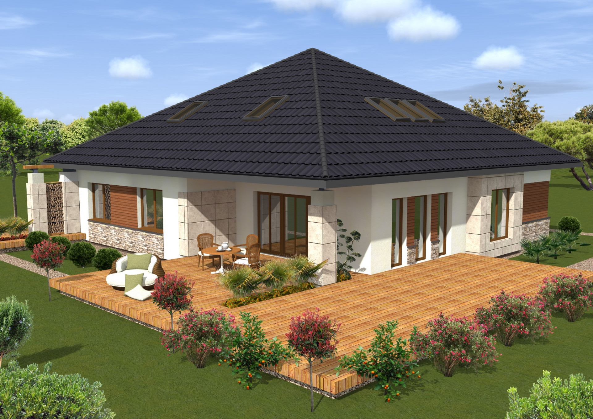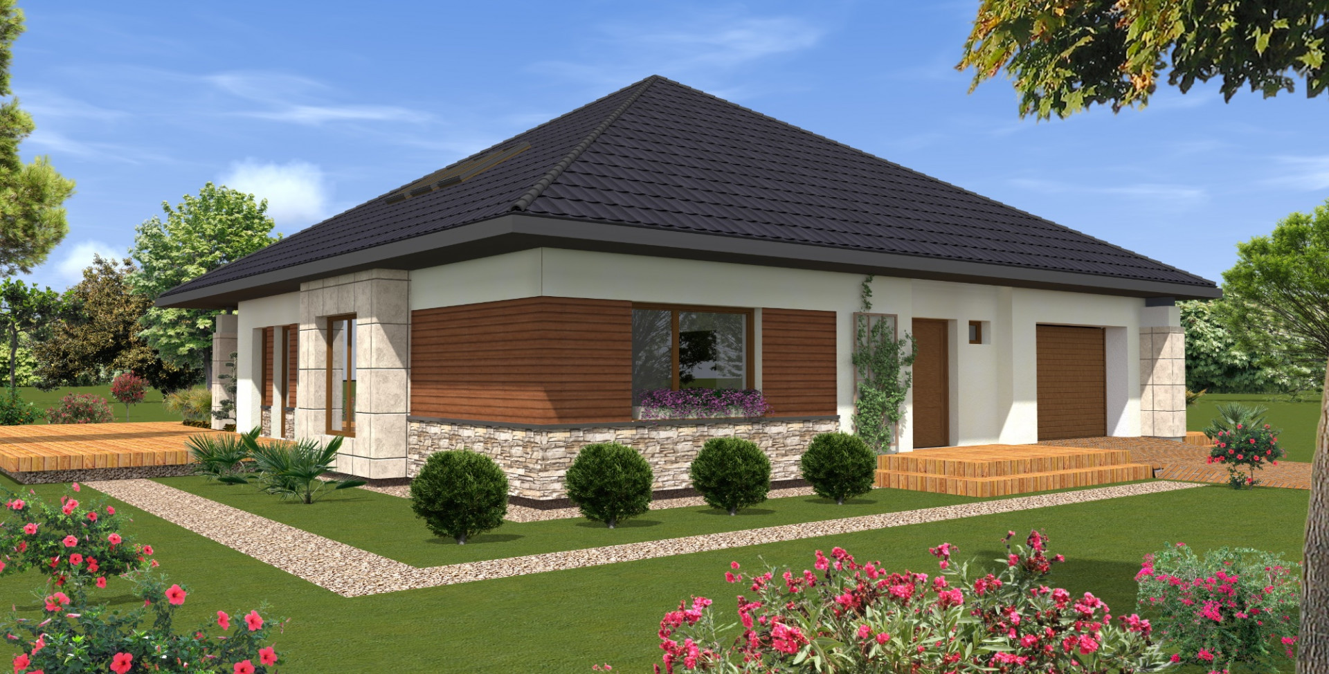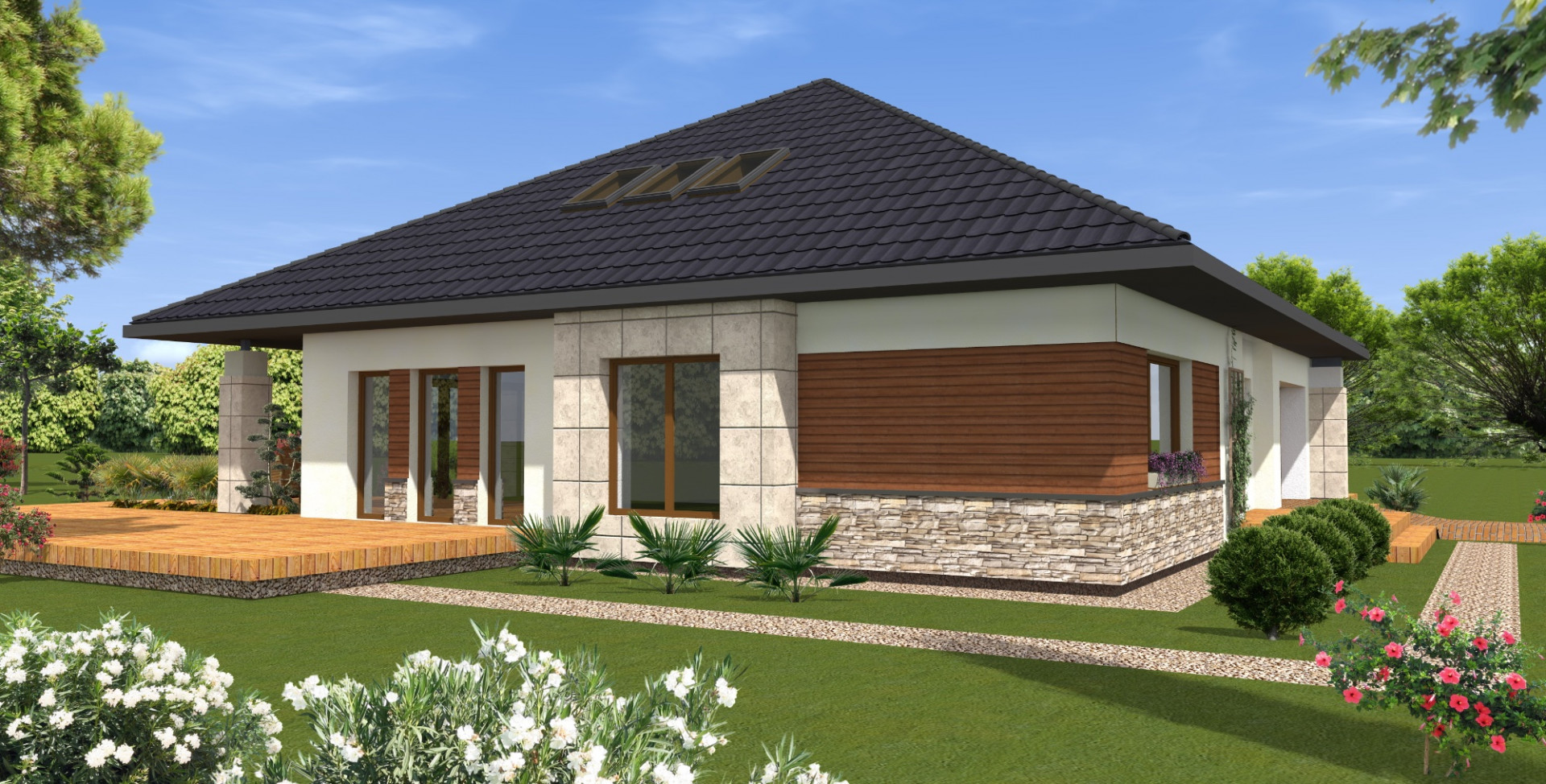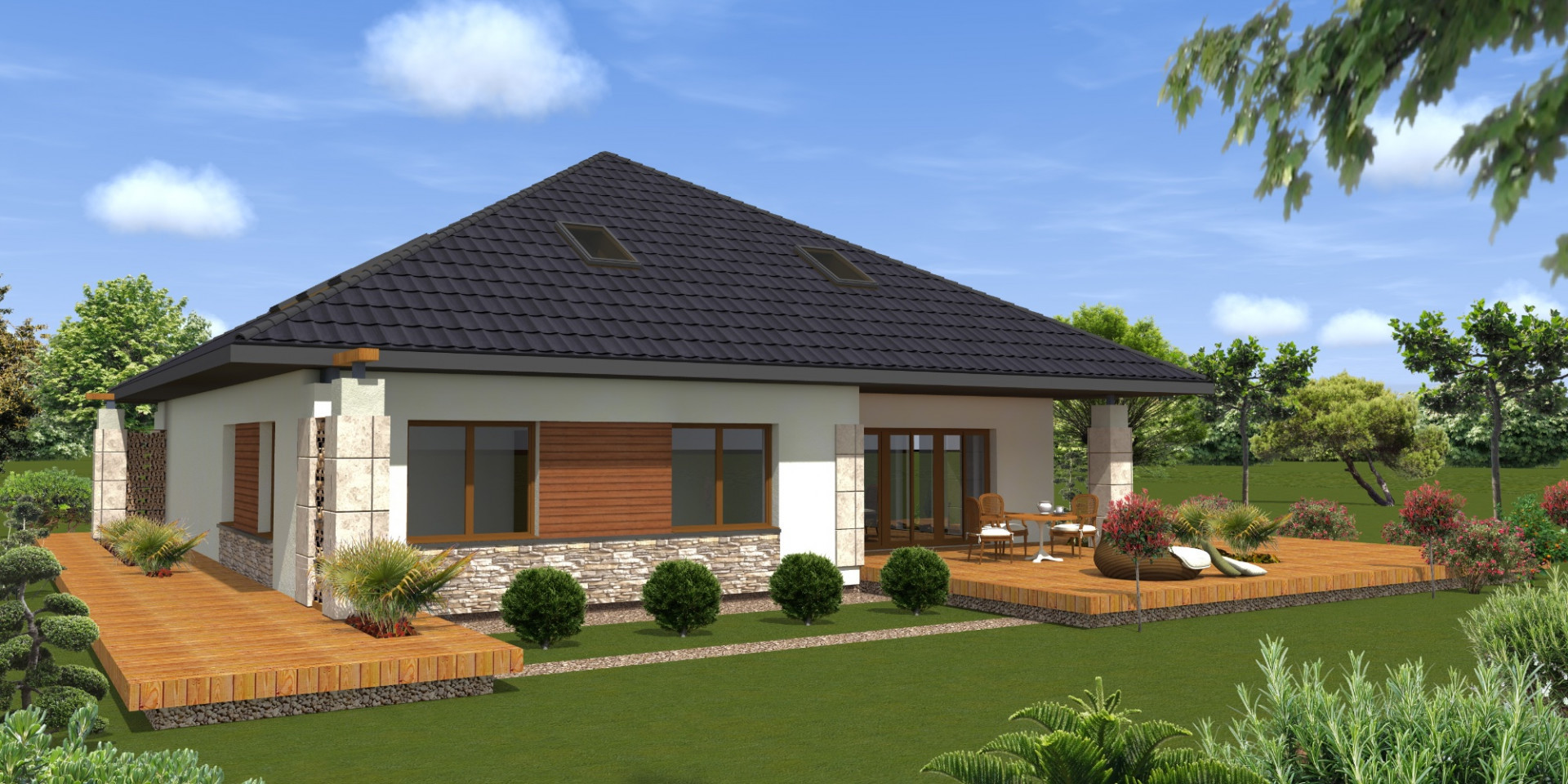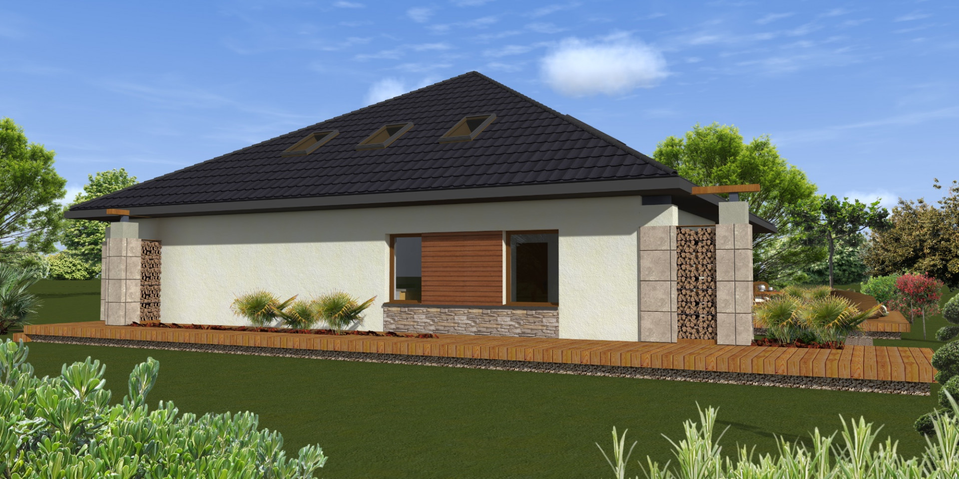 Komfortowy dom wolnostojący w otoczeniu lasu. Zaprojektowano parterowy budynek z częścią dzienna z dużym salonem i otwartą kuchnią w lewej części domu oraz prywatną częścią sypialną w prawej części domu. Obie części posiadają widok na ogród, a z salonu wychodzi się za zadaszony podcieniem taras.